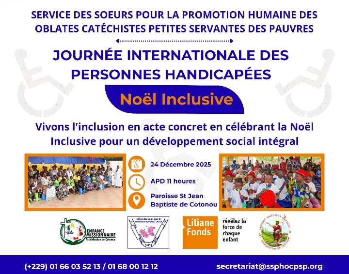 Le Service des Sœurs pour la Promotion Humaine des Oblates Catéchistes Petites Servantes des Pauvres (SSPH/OCPSP) organise, en collaboration avec la paroisse St. Jean Baptiste de Cotonou, une célébration spéciale de la Journée Internationale des Personnes Handicapées (JIPH) sous le thème : « Vivons l’inclusion en acte concret en célébrant la Noël inclusive, pour un développement social intégral ». L’événement qui est prévu le 24 décembre 2025 à 11 heures, vise à sensibiliser le public sur les droits des personnes handicapées tout en valorisant leur potentiel et en promouvant des comportements humanitaires.