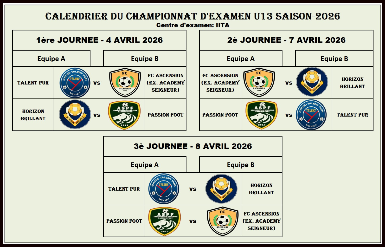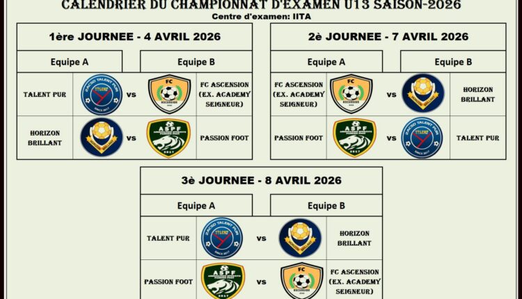 Les jeunes académiciens se donnent rendez-vous les 4, 7 et 8 avril 2026 sur le terrain d’IITA pour prendre part à un championnat d’examen. Organisée par 2ACSD Talent Pur. Cette compétition vise à évaluer et suivre la progression des enfants issus des différents centres participants.