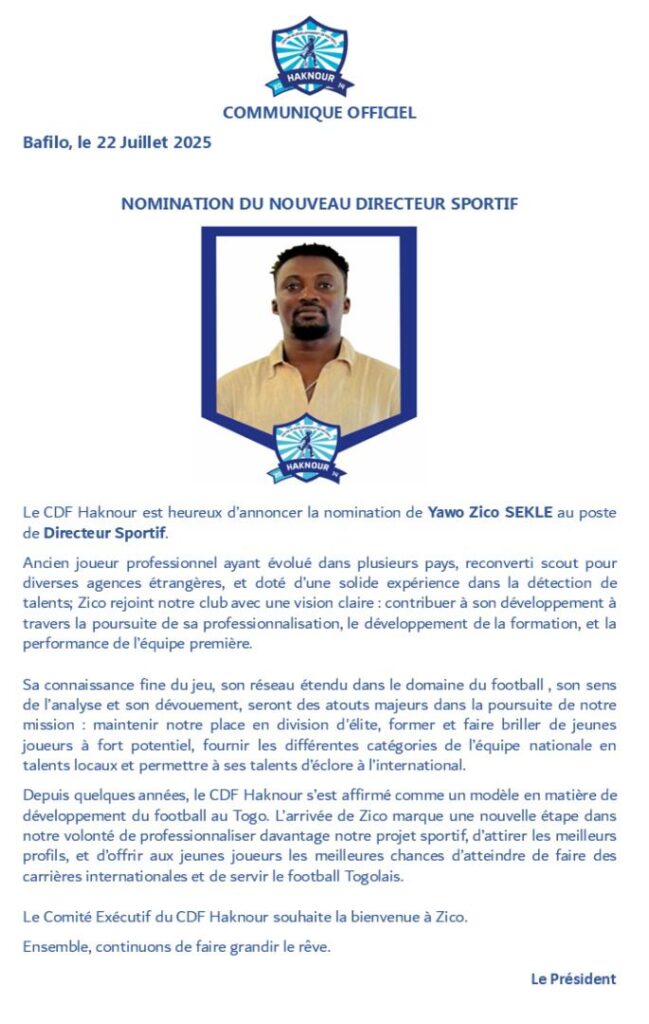 Yawo Ziko Sekle a été nommé Directeur Sportif du club d’élite togolais CDF Haknour depuis le 22 juillet 2025. Ancien International togolais reconverti scout pour divers agences à l’international, il fera de ce club un grenier des talents togolais exportables.